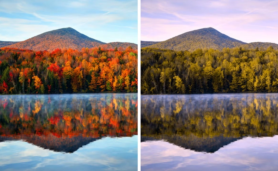 Bild: Rot-Grün-Fehlsichtige sehen die Landschaft links wie im Bild rechts dargestellt. Ihnen entstanden dadurch keine evolutionären Nachteile.