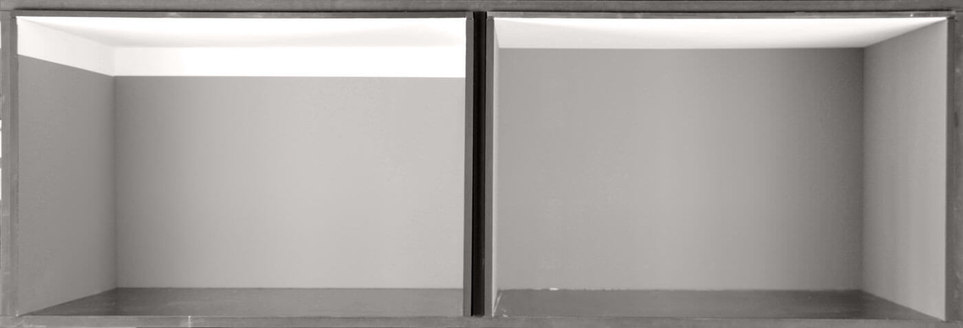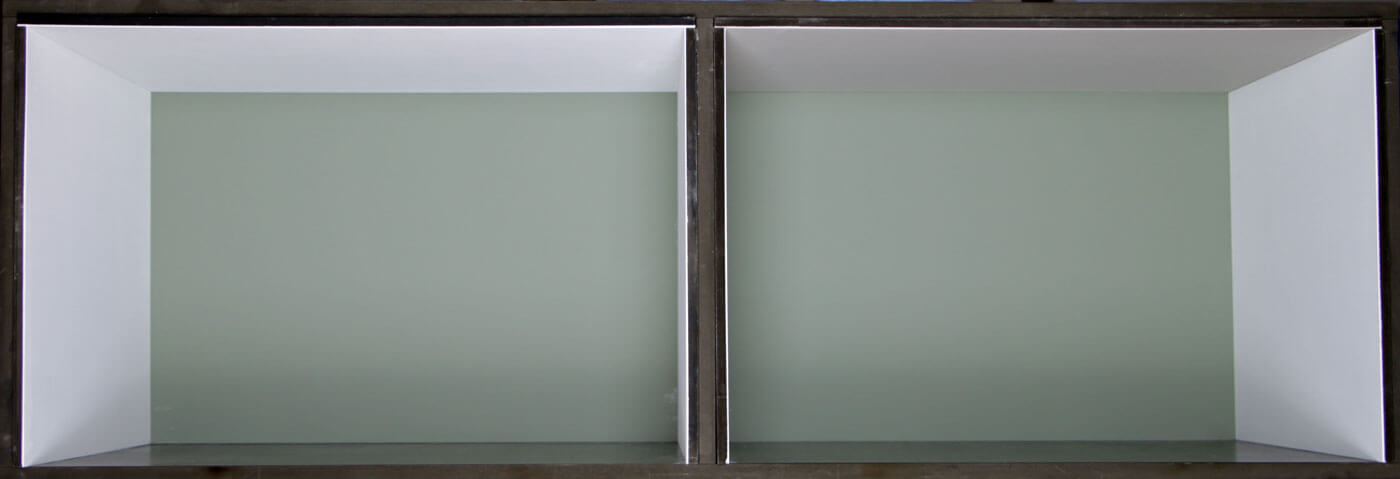 Oben: Salbeigrün (Rückwand), Seitenwände Porzellanweiss, Decke links Porzellanweiss, rechts Mondgrau. Unten: Decke Lichtweiss, Wände Gris.