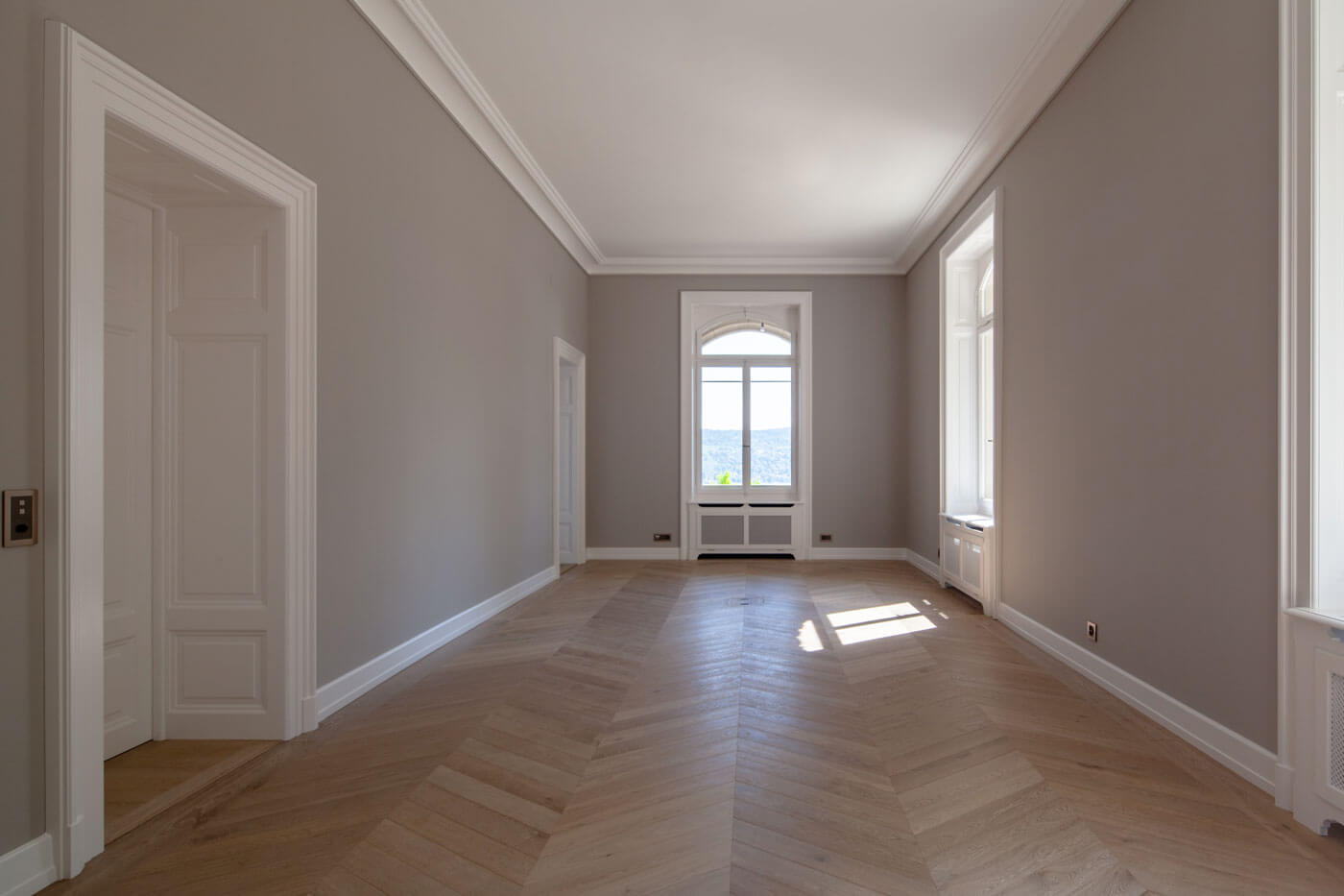 Für niedrige Decken ist Grau meistens eine bessere Farbe als Weiss, denn die weisse Decke wird stärker wahrgenommen. Wenn man die weisse Deckenfarbe in den Raum zieht, verkürzt das die Wand. Der Übergang wird nach unten versetzt und das lässt die Decke noch drückender wirken. Kleine Räume mit niedrigen Decken gestalten wir in der Regel einheitlich mit einem sanften, hellen Grau, wie Gris blanc, Gris lumineux oder Gris pâle. Der kontrastarme Raum vertieft sich im Schatten und die Dimensionen fallen weniger auf.