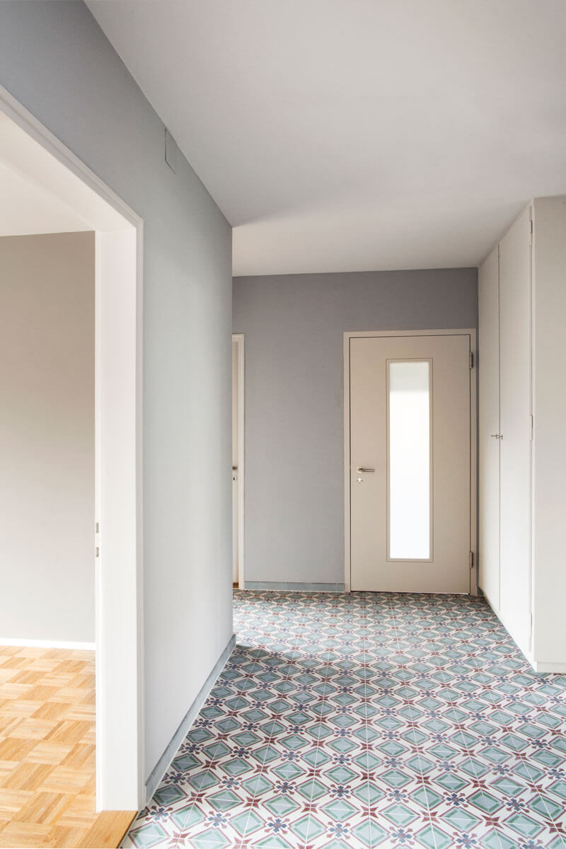 Angeblich soll man kleine Räume, drückende Decken und enge Passagen weiss streichen, das lasse «den Boden und die Decke optisch zurücktreten, sodass der Raum dadurch grösser wirkt» (Schöner Wohnen). Das ist falsch. Wir sehen das Hellste zuerst und helle Farben fallen mehr auf als dunkle. Architektin Pia Burtscher hat hier mit vier subtil abgestuften, grauen Farben dem Wohnraum Wärme, dem Durchgang Weite und der Architektur Spannung verliehen.