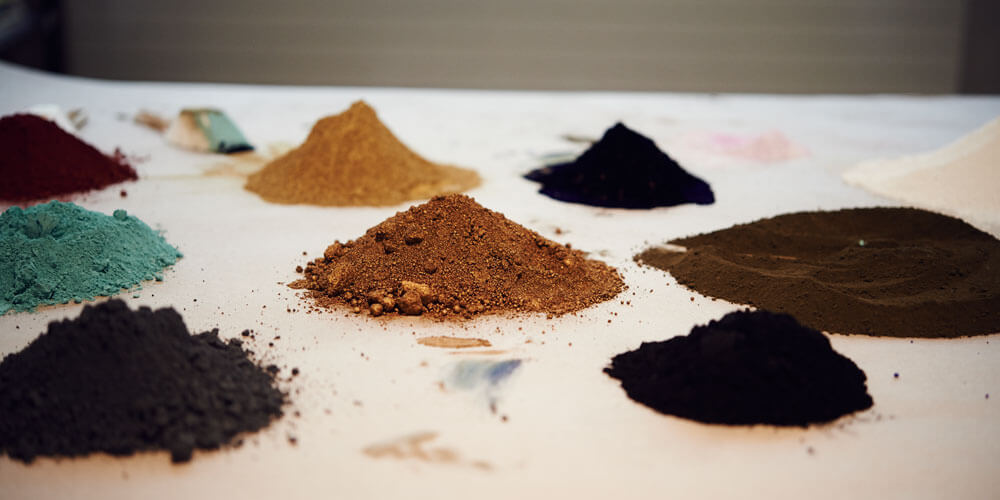 Bild: kt.COLOR Pigmente. Von oben links im Gegenuhrzeigersinn Rubinrot, Kobalttürkis, Nero Roma, Nero vite, Umbra gebrannt, Goldbronze, Kupferbronze.